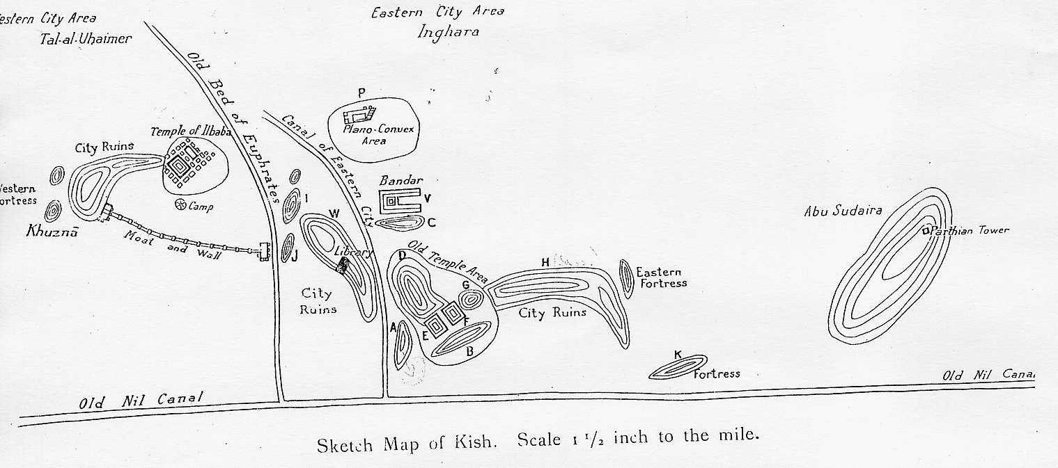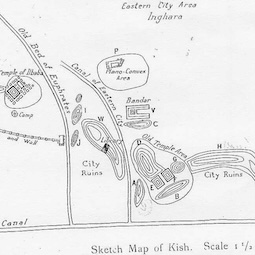 [/kish/images/moundw-fig3-large.jpg]3. Langdon's sketch map of Kish, showing the so-called "library" only as a block on the south-west of Mound W. The map is not to scale. Source: Langdon 1924: pl. 33 top.