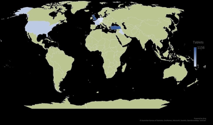 [/kish/images/kish-cunei-distrib-large.jpg]Map of the current global distribution of cuneiform tablets from Kish, based on data in the Kish corpus. Turkey and the UK have by far the largest numbers, as most of the inscribed finds from the de Genouillac and OFME excavations, were deposited in museums in Istanbul and Oxford, respectively. The collections in north America and Europe mostly represent purchases through the antiquities market in the early 20th century, while the 150 Kish tablets in the Iraq Museum were all returned from Oxford in the 1980s.