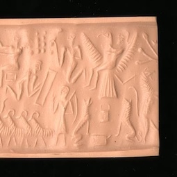 [/kish/images/etana-seal-large.jpg]1. تم صنع الختم الأسطواني الصغير هذا في العراق ، ما بين 2400 و 2200 قبل الميلاد. وهو منحوت من كتلة أفعوانية يقل ارتفاعها عن 4 سم، وقد يظهر جانبا آخر من أسطورة إيتانا. ويظهر هذا الانطباع الحديث للختم النسر في شجرة أعلى اليمين، ممسكا بشبل أسد (بدلا من بيضة ثعبان) ووالدا الشبل الغاضبان يخطوان ويزئران في الأسفل. بينما تركب شخصية تشبه إيتانا النسر في أعلى اليمين (في الواقع على يسار الشجرة). ويظهر وسط المشهد الرعاة وعمال الألبان وهم يصنعون الجبن. المصدر: BM 129480 ، المتحف البريطاني [https://www.britishmuseum.org/collection/object/W_1945-1013-24]، تم شراء الختم من جامع آثار خاص في عام 1945.