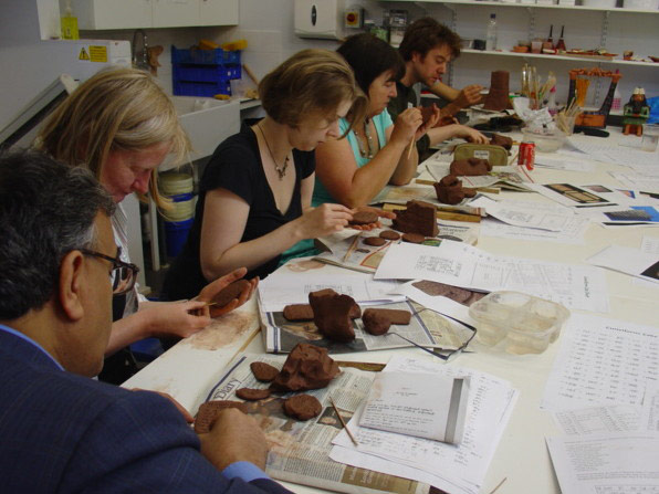 People writing tablets at a clay tablet workshop in September 2008, organised by the Enheduanna Society and sponsored by Birkbeck College, the British Institute for the Study of Iraq, and Holborn Community Development Project. Photo by Frans van Koppen. View large image.